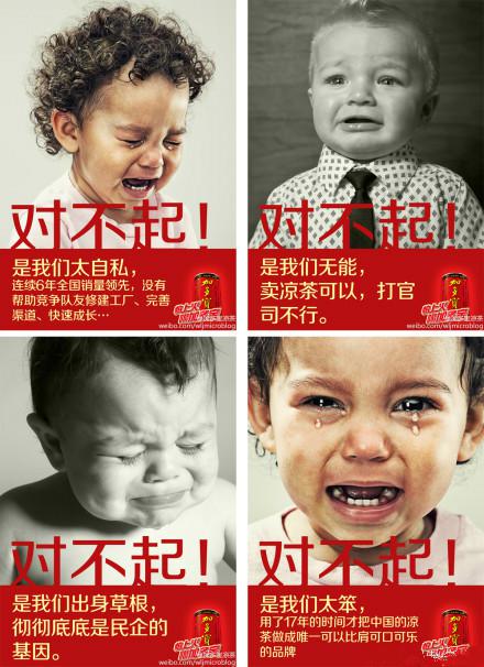 加多宝在与广药的商标争夺战中输掉了官司,广药集团收回鸿道(集团)有限公司的红色罐装及红色瓶装王老吉凉茶的生产经营权,从那以后两家企业的战争便愈演愈烈。2013年2月4日,加多宝在微博上做出了一组兼具视觉力与传播力的“对不起”系列图片,这组图片选取了四个哭泣的宝宝,并配以一句话文案诉说自己的弱势,图片表面悲情,实则却如利剑一般,剑剑刺在竞争对手的痛处,给予对手致命的打击。如果用一种武功来形容的话,那就是杨过在悲情中释放力量的黯然销魂掌。